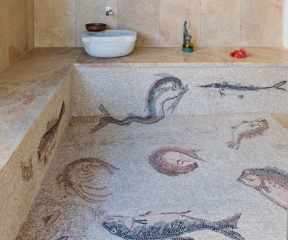 Das Ayvalik-Mosaik – verfugt und bereit zur Nutzung! Das Ziel dieses Projekts war es, einen Raum in einem restaurierten griechischen Stadthaus in Ayvalik an der nördlichen Ägäisküste der Türkei mit einem Mosaik zu schmücken. Dieses neu gebaute Mehrzweckbad, das sowohl vom Garten als auch vom Haus aus zugänglich ist, verfügt über die Merkmale eines türkischen Bades/Hamams: einen beheizten Fußboden, beheizte Marmorbänke und -wände, dient aber auch als Wasserspielplatz für den Innenhof im Sommer und als zweites Duschbad für das 6-Betten-Ferienhaus. Fasziniert von der Schönheit der antiken Mosaike wollte ich einige der dekorativen Elemente eines antiken Mosaiks nachbilden, um sie in unserem modernen Leben wieder auftauchen zu lassen. Und ich wollte diesem Mosaik den Zweck geben, für den Mosaike ursprünglich geschaffen wurden: den praktischen Zweck, einen Boden zu bedecken, damit er besser begehbar ist, Wasser vom Boden besser in ein Abflusssystem abgeleitet werden kann und der Boden besser gereinigt werden kann, einen dekorativen Zweck, um den rohen Wänden Farbe und Muster hinzuzufügen und einen kommunikativen Zweck, um den Betrachtern einen Anlass zu geben, über die...